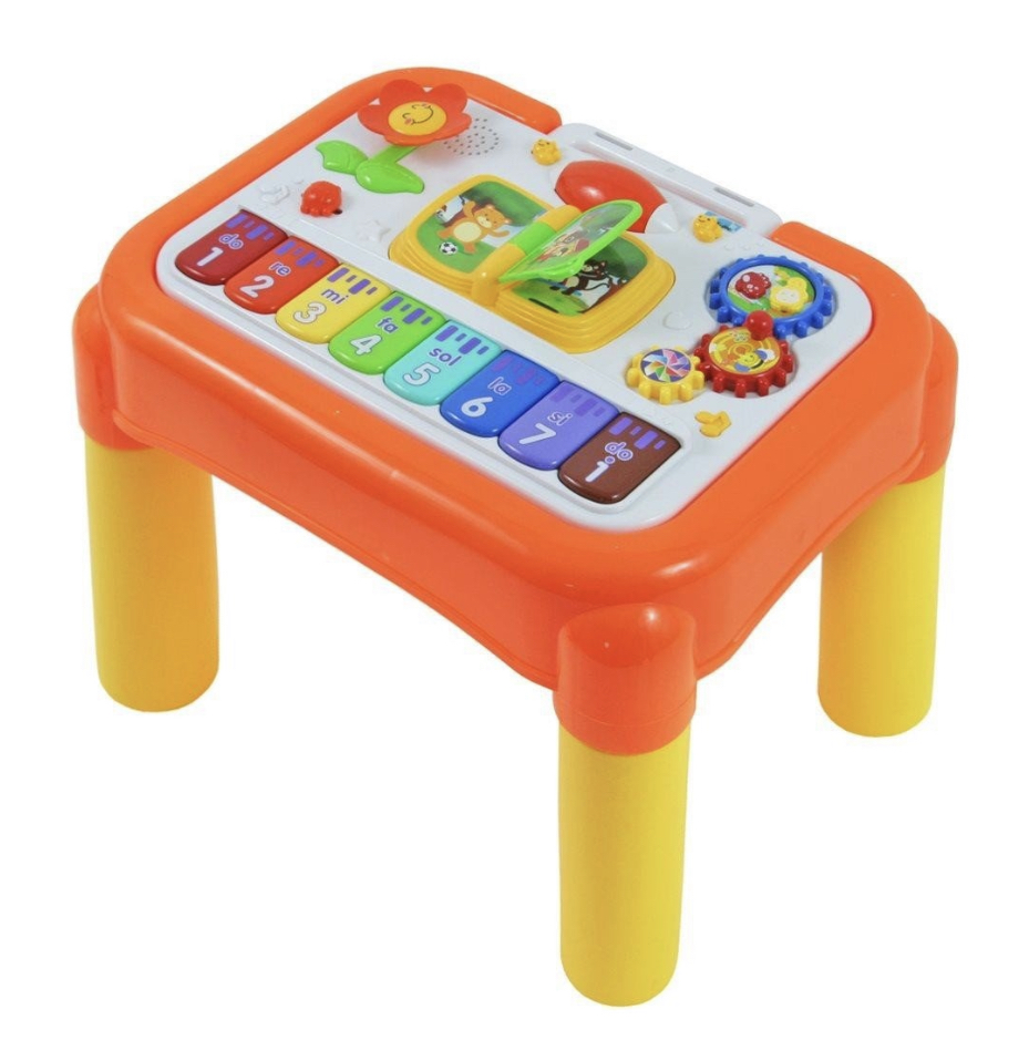 Multifunkční stoleček 3v1 + psací tabule. Hračka má mnoho různých funkcí, které přitahují pozornost každého dítěte. Hlavní modul obsahuje klavír, otáčející se ozubená kolečka, květinku, knížečku, chrastítko, hlavní vypínač a ovládání hlasitosti zvuků. Pomocí kláves si dítě může pouštět veselé melodie, učit se anglicky názvy barev, nebo hrát svou vlastní melodii. Soustava otáčejících se ozubených koleček procvičuje jemnou motoriku vašeho dítěte. Po zapnutí přepínače se květinka začne otáčet a ozve se veselá písnička. Otáčením listu knížečky hračka vydává zvuky zvířat. Hračka je napájena dvěma 1,5 V AA bateriemi, které nejsou součástí dodávky. Na druhé straně modulu je oblíbené kreslící/mazací tabule, jejíž součástí jsou speciální pero a razítka. Tato multifunkční vzdělávací hračka rozvíjí představivost, podporuje koncentraci a motorickou koordinaci dítěte. Prostřednictvím hry se dítě učí kreslit a psát, rozpoznává barvy a tvary.