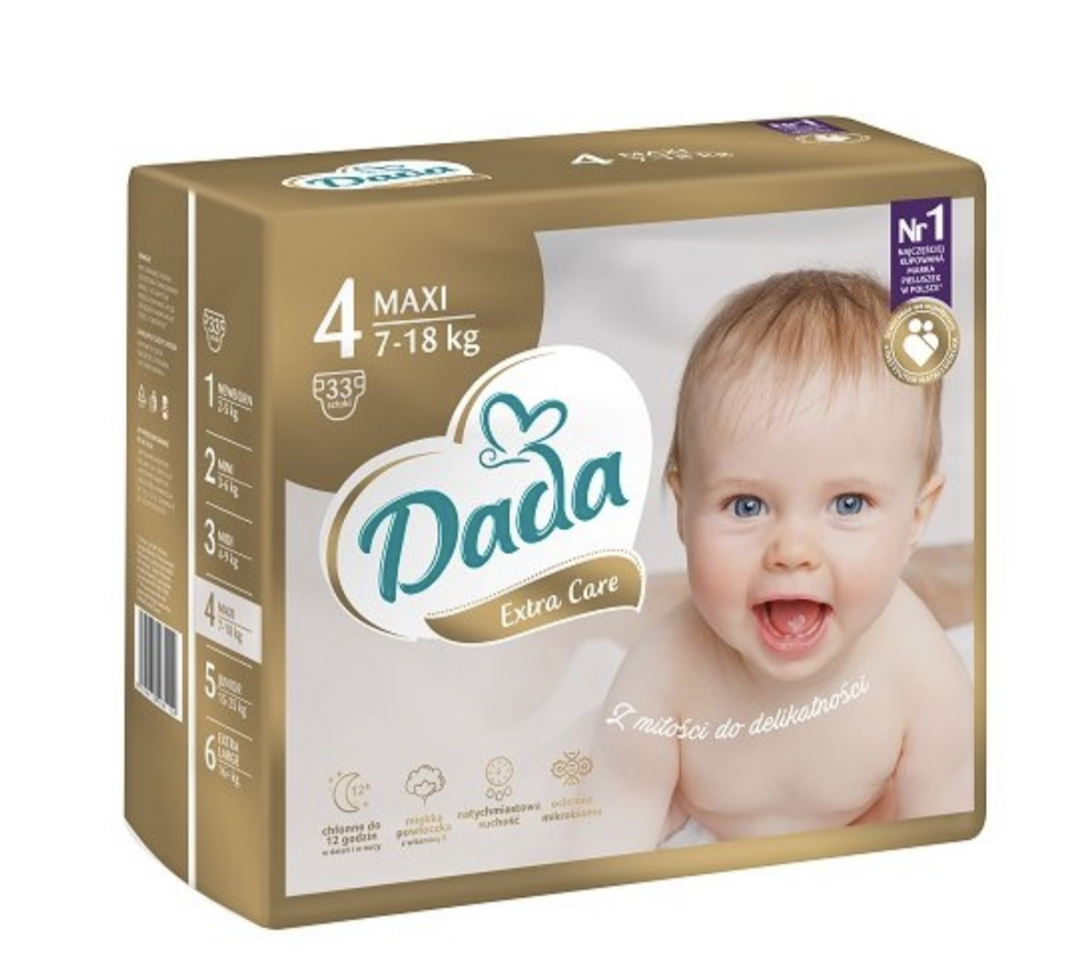 Dětské plenky Dada extra care 4 maxi, plenky vytvořené pro děti o hmotnosti mezi 7-16 kg, jsou perfektní a zaručující až 12 hodinové pohodlí - jak pro batolata, tak pro rodiče.Plenky pečují o kůži dítěte - měkký, dermatologicky testovaný materiál a s přidáním vitaminu E dodatečně chrání pokožku.Trojité, široké suché zipy se snadno upevňují.Prodává se v baleních po 33 kusech.