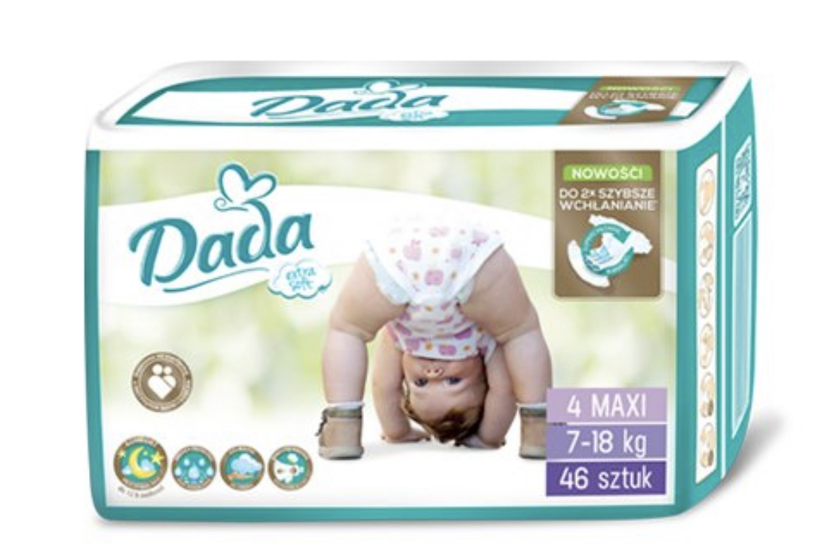 Dětské plenky Dada extra soft 4 MAXI plenky pro děti o hmotnosti 7-18 kg. Nové pleny Extra Soft jsou tenčí, pružnější, lehčí, ale také lépe vstřebávají tekutinu a to díky nově použité technologii absorpčních kanálků, díky kterým lépe rozvádějí vlhost.Pro pohodlí batolete jsou plenky anatomicky upevněny na těle tak, aby neohrozily jeho pohyblivost a současně - díky elastickým stranám - dobře padnou a perfektně těsní.Unikátní nátěr s přídavkem extraktu aloe pomáhá chránit kůži dítěte. V balení 46 kusů.