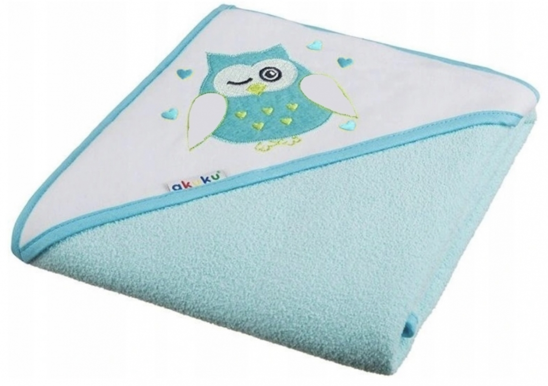 Krásná dětská osuška Akuku s obrázkem a kapucí. Osuška je vyrobena z příjemného a měkkého materiálu, ideální pro miminka. Vnitřní strana osušky je bavlněná, vnější fleecová pro lepší zahřátí. Rozměry: cca 80x80 cm. Složení: 100% bavlna.