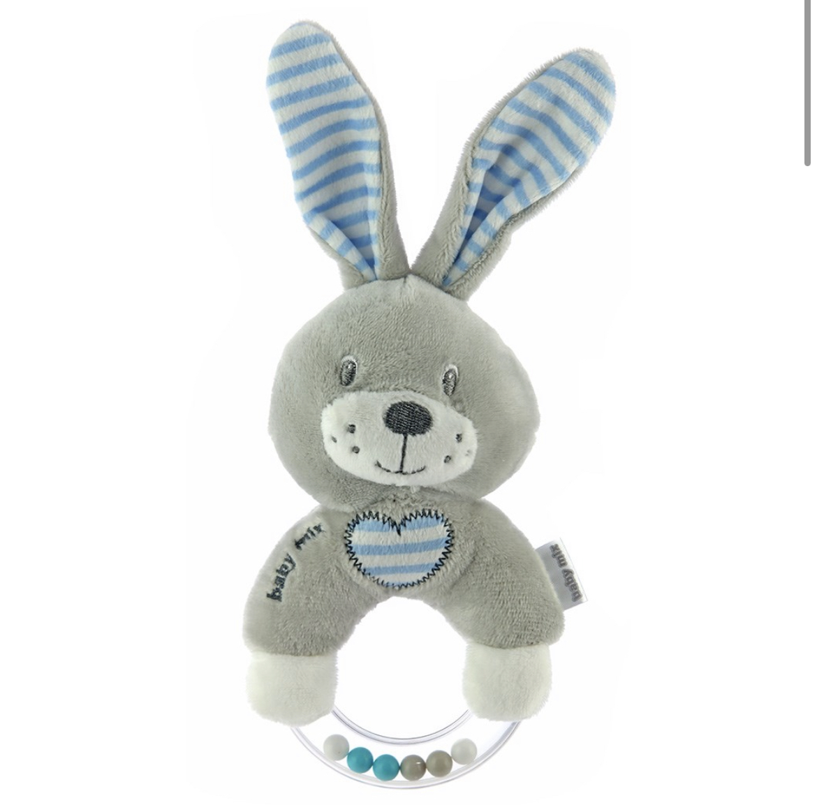 Krásné chrastítko/kousátko pro miminka, které se jim díky malému rozměru a tvaru bude dobře držet v dětských ručičkách. Plyšové chrastítko s obličejíčkem králíčkav modré barvě obsahuje kousátko pro podporu prořezávání prvních zoubků. Ouška zvířátka šustí. Jemně chrastí a stimuluje rozvoj koordinace a smyslů. Chrastítko je vyrobené z kvalitních materiálů a lze ho snadno umýt.