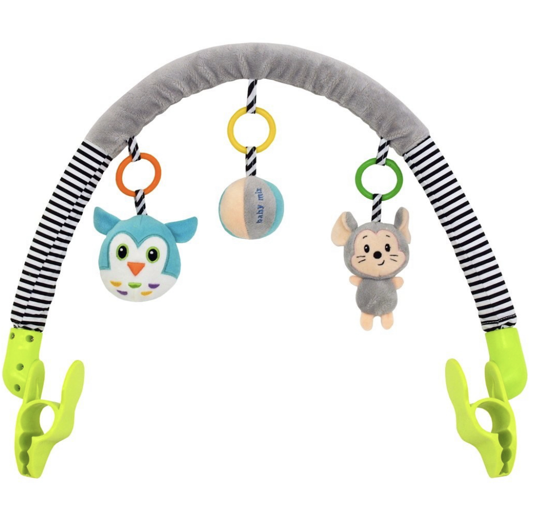 Krásná barevná hračka-hrazdička Baby Mix do kočárku. Na hrazdičce jsou plyšové hračky ve tvaru myšky a sovy. Madlo hračky má dva klipy, kterými lze hračku připevnit ke kočárku, lehátku nebo autosedačce. Tvary a barvy hračky lákají pozornost dítěte, učí ho, baví a rozvíjí tak dětskou fantazii. Hračka je vyrobená z kvalitního a příjemného materiálu. Výška hraček cca 12 cm. Délka madla cca 80 cm. Vhodné pro děti od 3 měsíců.
