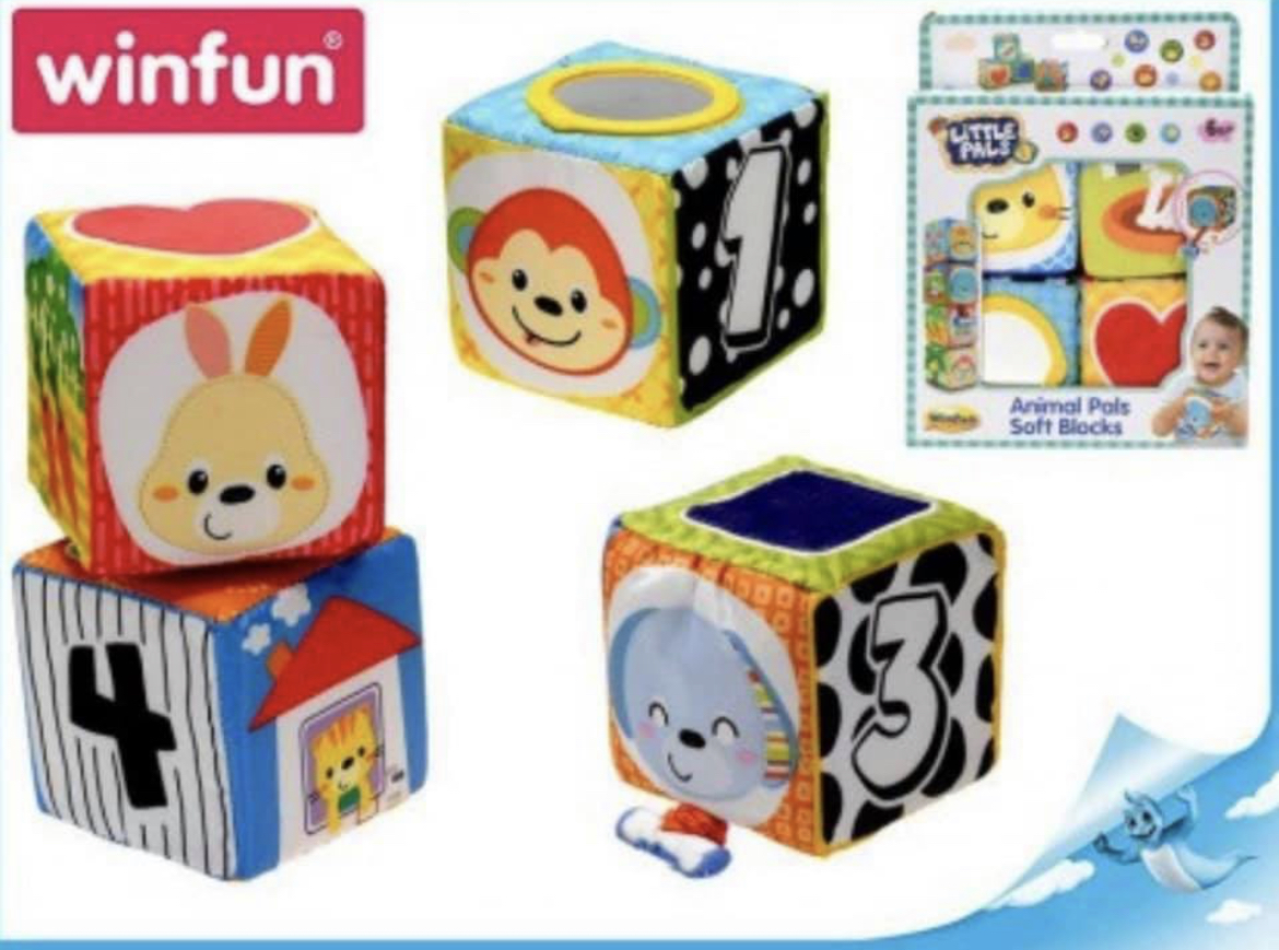 Balení obsahuje 4 měkké kostičky, které jsou nádherně malované. Zobrazují čtyři roztomilá zvířátka s jejich oblíbenou potravou. Z kostek lze postavit komín podle výrazných černobílých čísel nebo logicky navazujících obrázků. V neposlední řadě obsahují různé barvy s rozličnými vzory a tvary, které jsou z rozmanitých materiálů, včetně bezpečného zrcátka. Kostka s pejskem je navíc vybavena tahací kostičkou. Po jejím vytažení začne kostka jemně vibrovat. Didaktická hračka Winfun kostky rozvíjí smyslové vnímání.