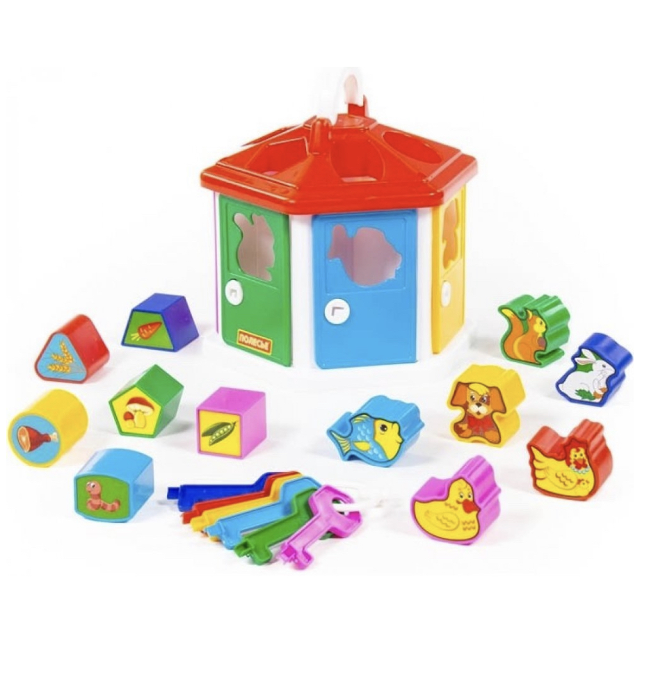 Didaktická hračka - vkládačka, domek z plastu, v balení klíče na dvířka a 12ks vkladačiek. Podporuje rozvoj dovedností, rozličovania tvarů a barev.
